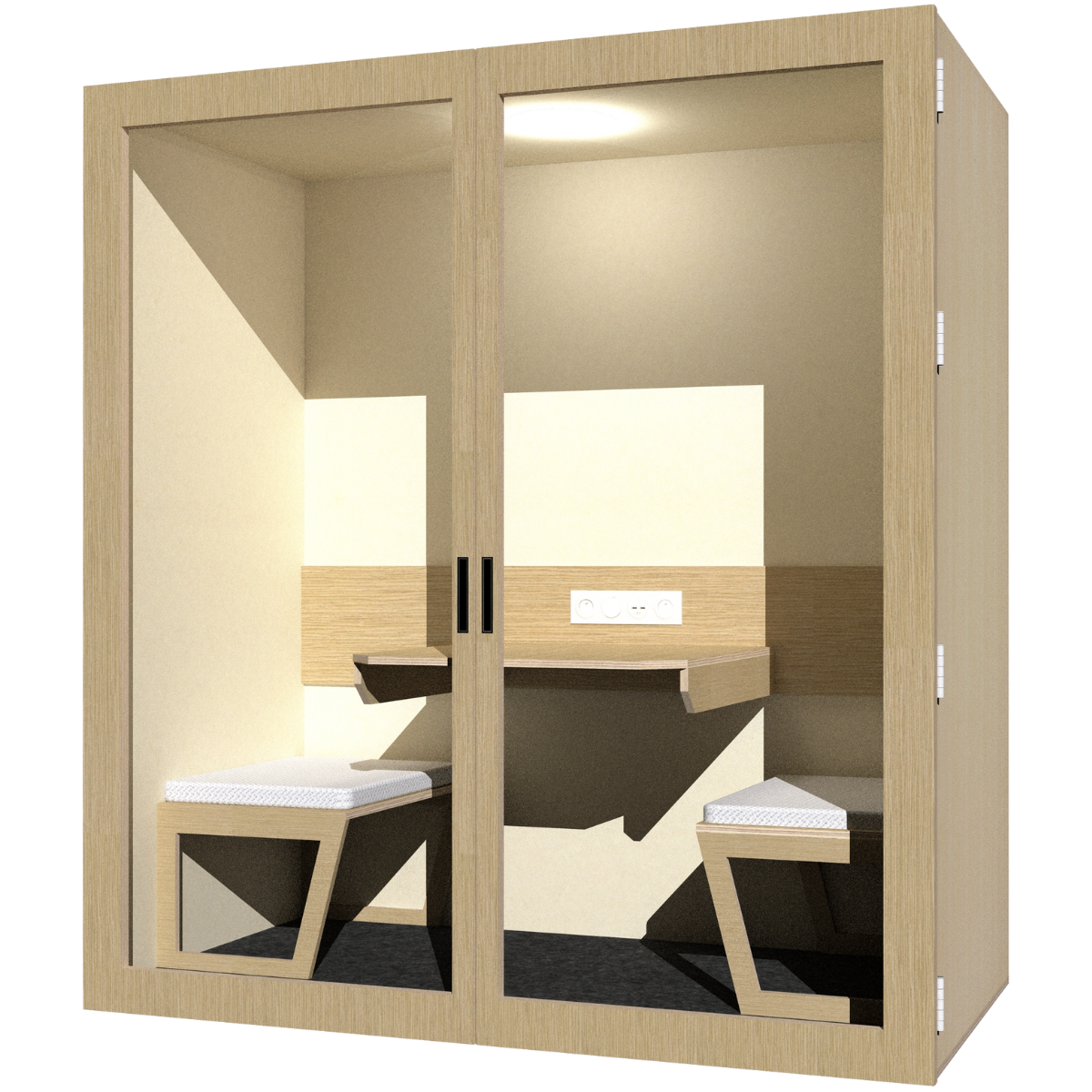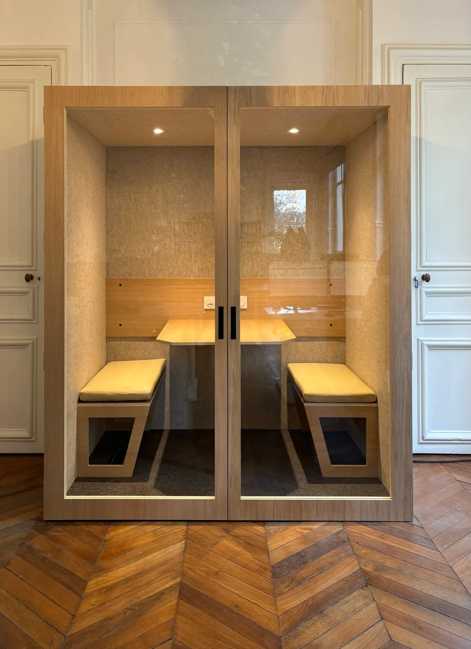 Découvrez notre phone box double, l’espace idéal pour les rendez-vous à deux, les sessions de travail collaboratives et les visioconférences.